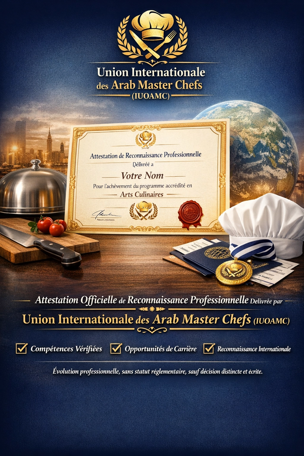 عند إتمام برامجنا المعتمدة، يحصل المشاركون على شهادة اعتراف مهني رسمي صادرة عن الاتحاد الدولي ماستر شيف العرب (IUOAMC)، تُثبت استيفاءهم لمتطلبات البرنامج من حيث الكفاءة، والمعرفة، والتقييم المعتمد في مجالات فنون الطهي.