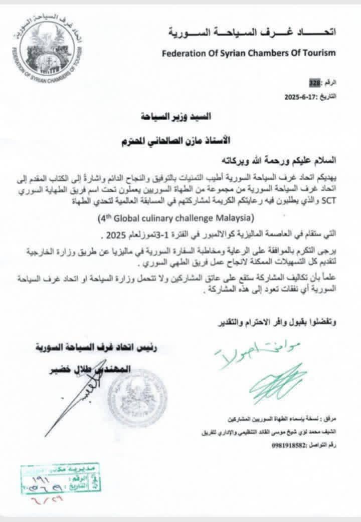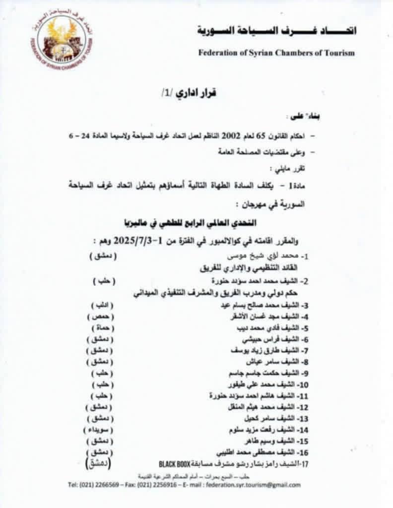 واعتمادهم رسميًا كممثل للمنتخب الوطني السوري للطهاة، ومشاركتهم في المسابقة العالمية GCCM المقامة في ماليزيا 🇲🇾.